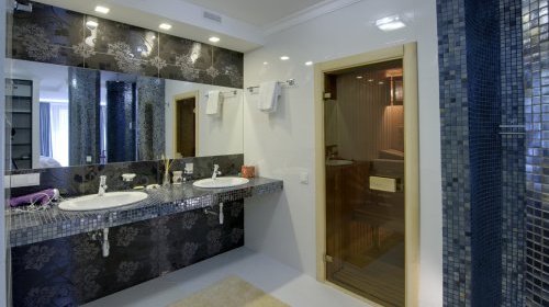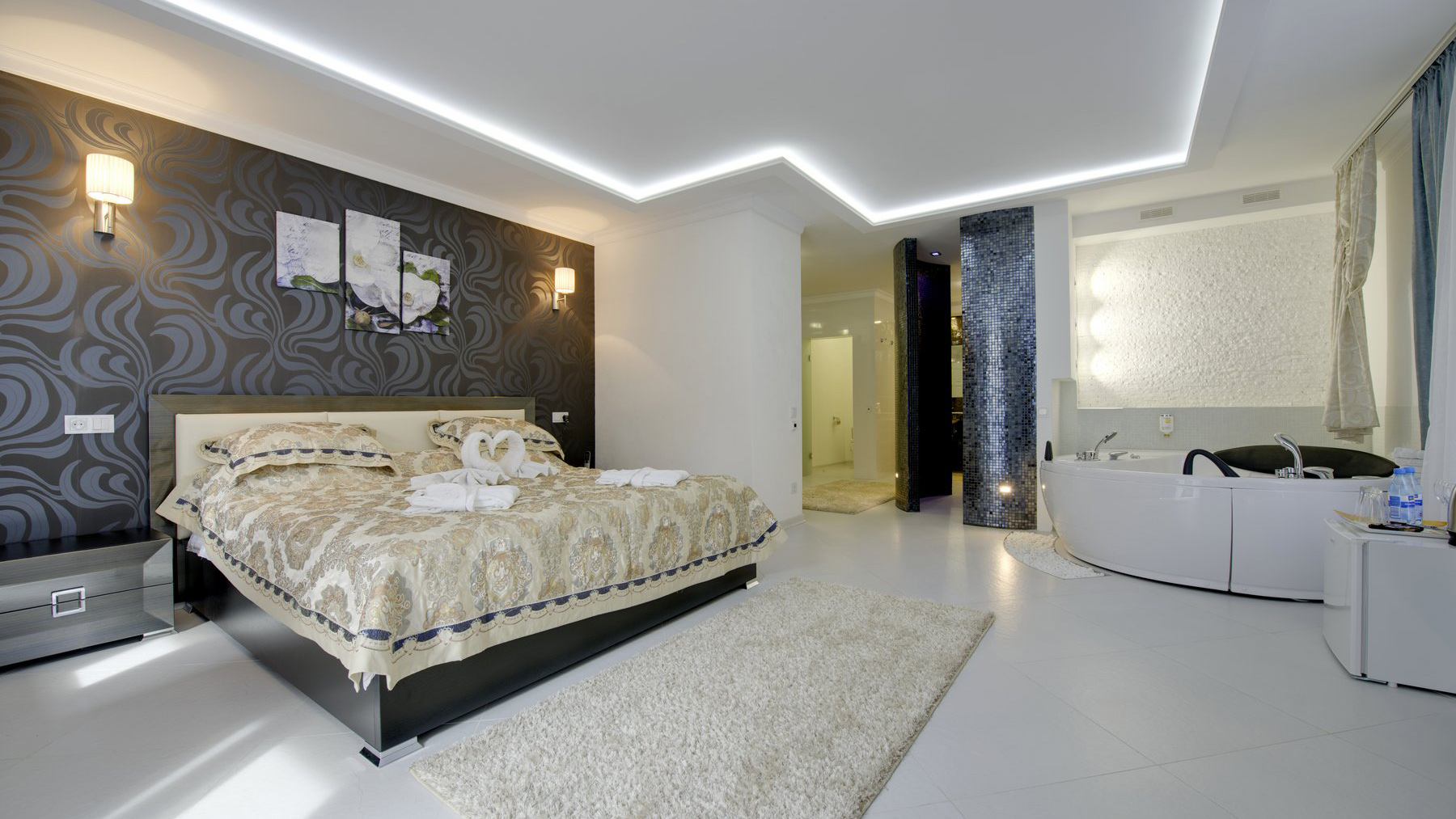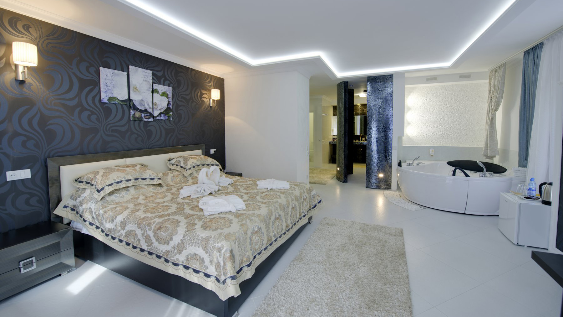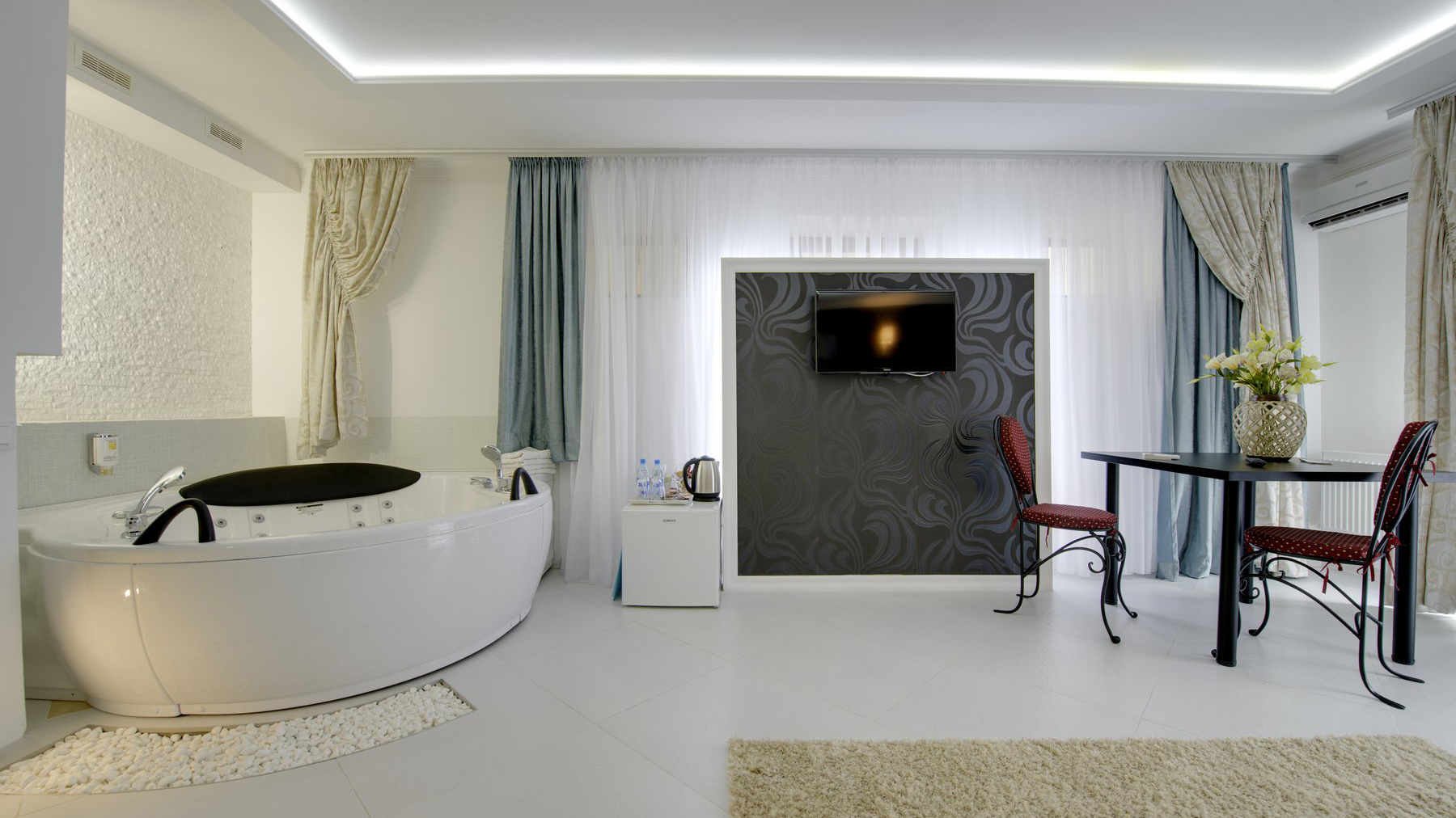 Этот номер не без основания может считаться гордостью нашего отеля и придется по душе тем, кто любит СПА-мотивы. Все пространство максимально открыто и совмещено, создавая атмосферу уюта. Здесь есть сауна и гидромассажная ванна, которая находится рядом с большой кроватью. Гости могут насладится просторным душем с подсветкой, оформленным в стиле "open space", который является одним из главных элементов релакс-дизайна. Более семи вариантов освещения пространства удовлетворят самого искушенного гостя и помогут создать максимально комфортную атмосферу для отдыха. Этот номер также идеально подойдет для новобрачных и пользуется у них особой популярностью. Молодоженам, помимо праздничного оформления, фрукты и шампанское в подарок.