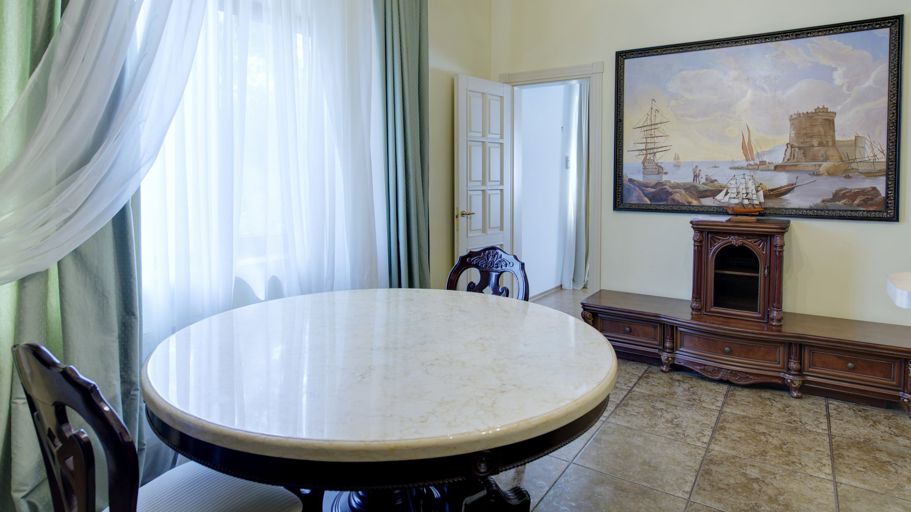 Комфортабельные апартаменты, которые состоят из двух комнат: спальни и кухни-гостиной позволят ощутить себя в домашней обстановке. В спальне имеются: широкая двуспальная кровать, плазменный телевизор. Кухня оборудована мебелью, электрической плитой с духовкой, обеденным столом и большим холодильником.